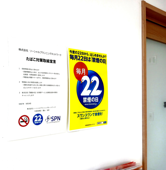 株式会社ソーシャルプランニングネットワークでは、健康経営の一環として、たばこ対策に取り組んでおります。