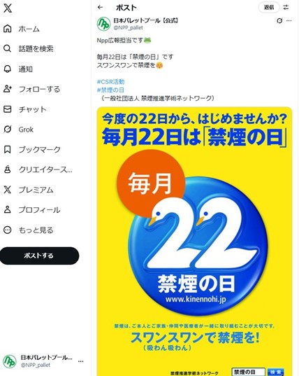 ・毎月22日を構内禁煙デーとし、Facebook、Xに投稿し周知をはかっています。